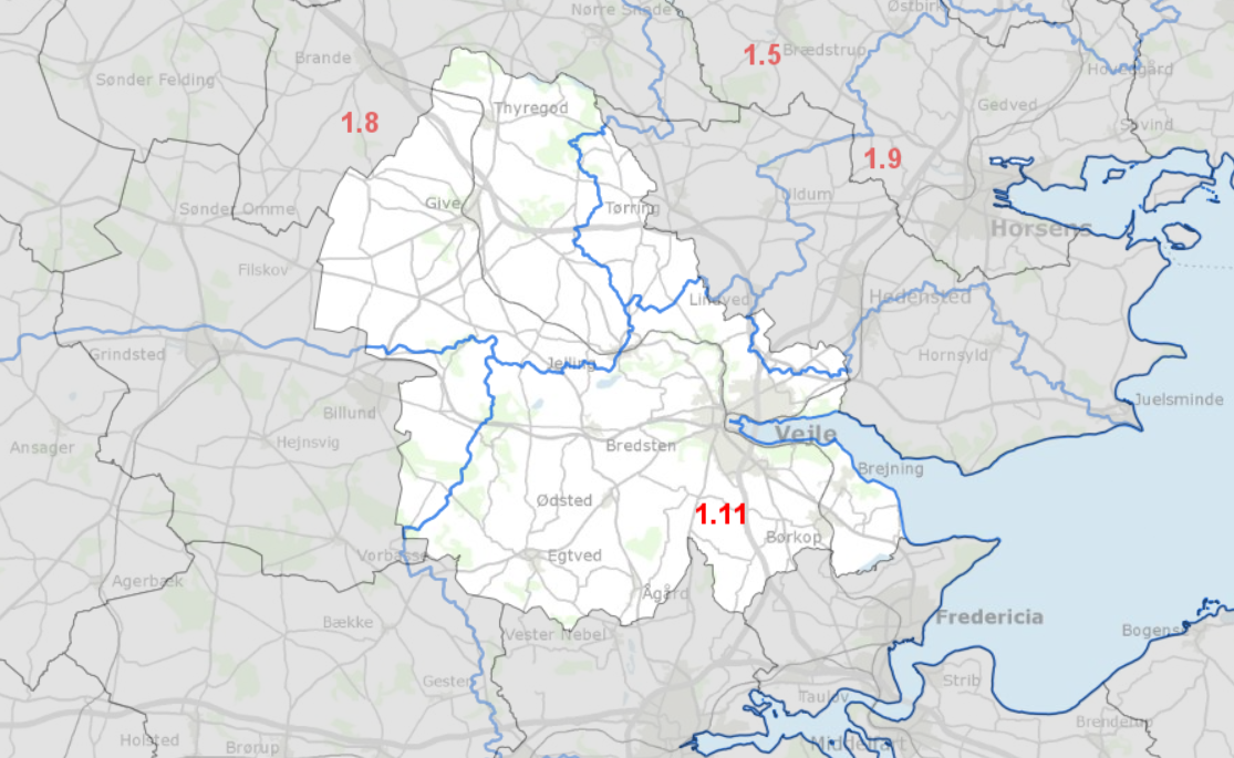 Hovedparten af kommunens vandløb afvander til Vejle Fjord (Lillebælt 1.11) og Ringkøbing Fjord (1.8). Tre mindre vandoplande i Vejle Kommune afvander til henholdsvis Horsens Fjord (1.9), Randers Fjord (1.5) og Vadehavet