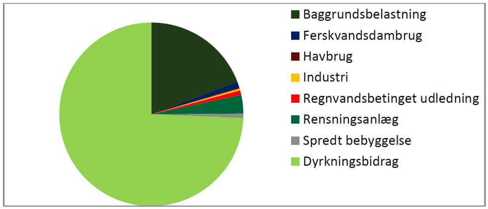 Nedenstående figur fra statens vandområdeplan viser, at ca 75 % af kvælstoftilførelsen i det samlede opland kommer fra dyrkningsbidrag. Ca. 19 % stammer fra det naturlige baggrundsbidrag, og ca. 6 % stammer fra punktkilder.