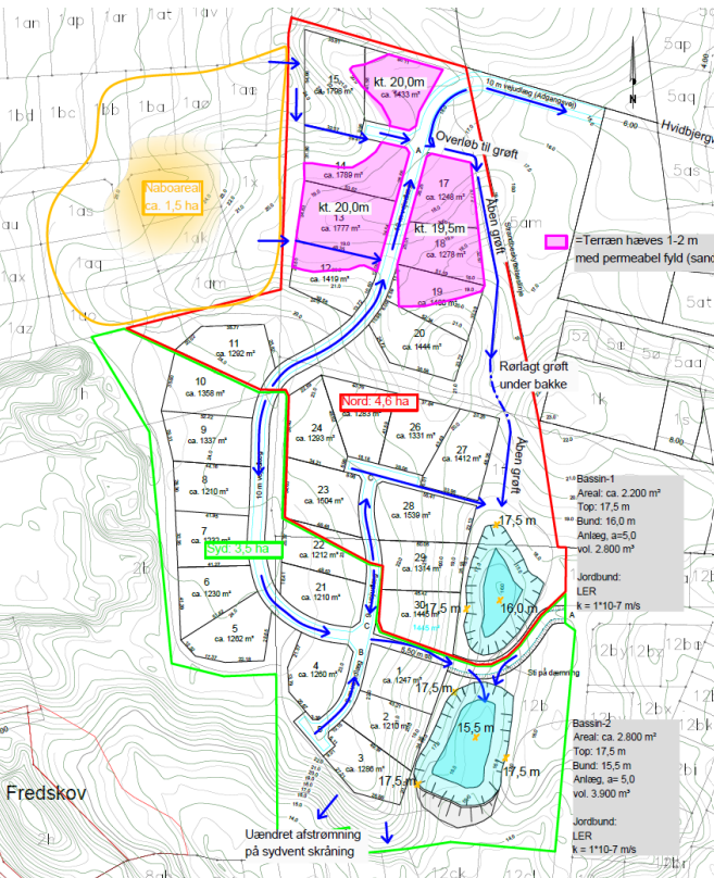 Til overfladevand fra veje og fællesarealer skal der etableres to regnvandsbassiner mod sydøst i lokalplanområdet til at håndtere hhv. hverdagsregn og skybrudsregn. Regnvandsbassinerne har ikke udledning til recipient. Overfladevandet skal nedsive og fordampe fra regnvandsbassinerne.