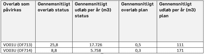 Af nedenstående tabel fremgår de beregningsmæssige reduktioner vedrørende overløbsmængder og antal.